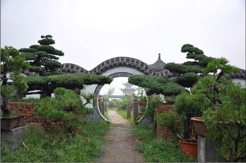大門是一座雕梁畫棟的仿古建筑,進(jìn)門迎面一堵萬(wàn)福墻,墻后向北是迎賓大道,兩旁三排40株200年以上樹齡的大板松,風(fēng)度如謙謙君子又如三軍儀仗隊(duì)禮節(jié)待客;向西是觀景路徑,穿過(guò)一片樹墩年齡三十年以上、造型各異的敞開式松柏盆景小品園后。最先看到精品園“蓄剪拉扎吊朽,自然為上;高平深遠(yuǎn)中近,神韻是本”的風(fēng)范,園里整齊擺放著盆景大師新近創(chuàng)作的黑松為主的盆景精品。黑松是典型的北方樹種,表現(xiàn)出敦厚樸實(shí)、堅(jiān)韌頑強(qiáng)的氣質(zhì),類似山東大漢豪爽大氣的秉性;制作松樹盆景并不是大自然中松樹的單純模仿,而是藝術(shù)化的再現(xiàn);大師們根據(jù)需要或提根,促其懸根露爪,以增蒼老之態(tài);或剝?nèi)ゲ糠謽淦ぶ谱魃裰蛏崂桑员憩F(xiàn)雖歷經(jīng)滄桑依舊生機(jī)盎然的神;西進(jìn)逸品園意境豁然開朗,心情陡然放松,兩棵千年大板松如主人般向你招手致意,其他經(jīng)年歷月的耐賞成熟盆景,體現(xiàn)了“剪法減法化簡(jiǎn)法,逸心益心歸一心”的主旨。